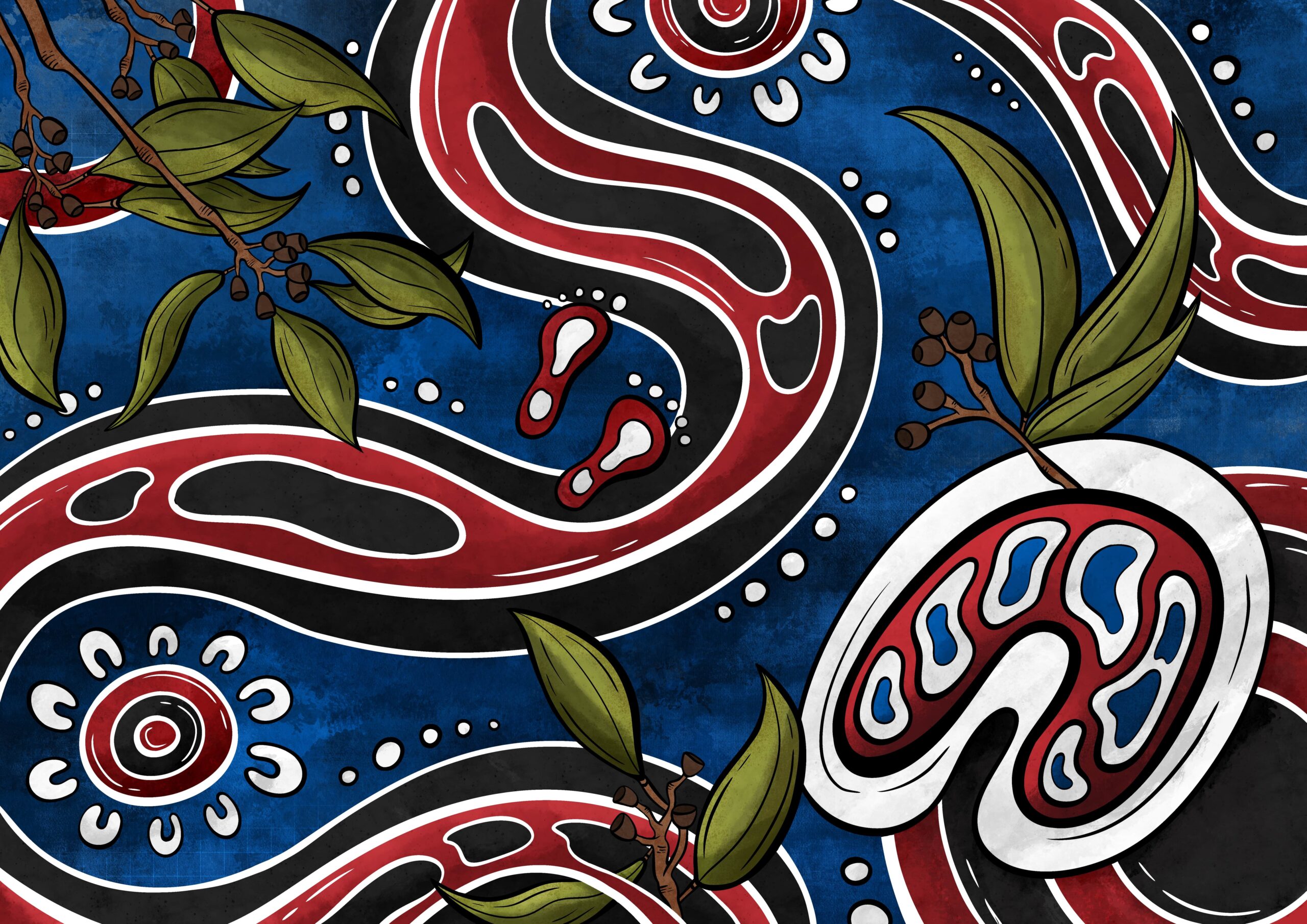 Our logo was designed by Keagan Malia, a proud Wamba Wamba man from Swan Hill. After completing Year 12, Keagan pursued his passion for art through Graphic Design at RMIT University in Melbourne. Soon after, he began his career at Kinaway Chamber of Commerce, where his skills and appreciation for cultural heritage have continued to grow.